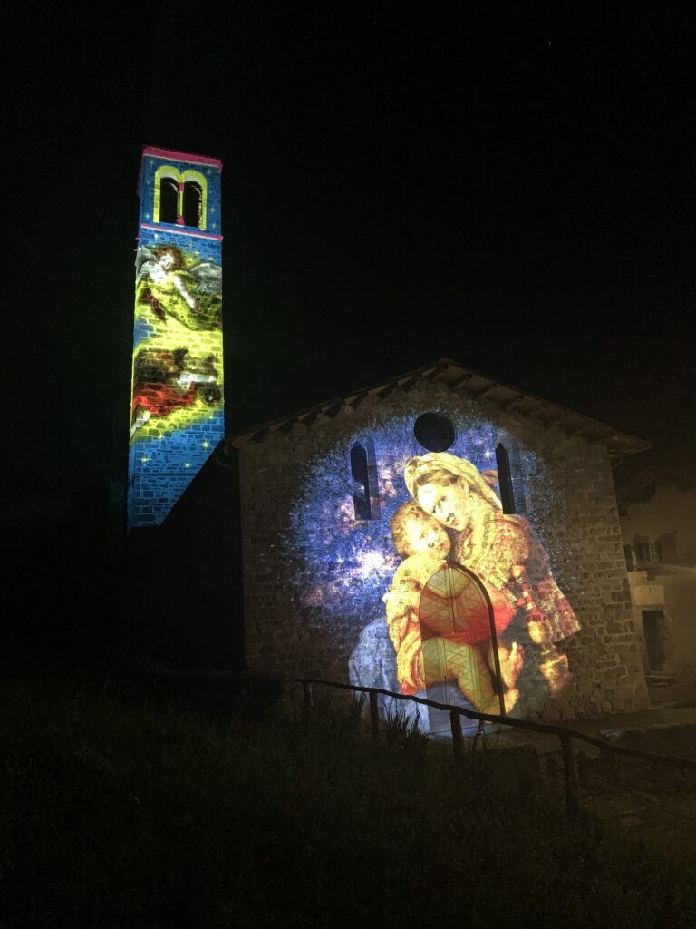 Sulla facciata della chiesa proiezione del dipinto olio su tela “Il Canto degli Angeli” di William Bouguereau.