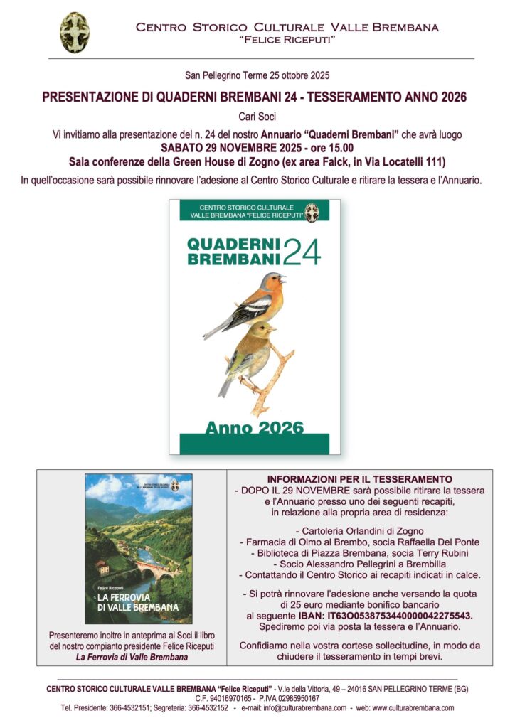 Mentre si dibatte se prolungare la tramvia da Villa d’Almè a Zogno o oltre, sabato 29 novembre, alle 15, alla Green House di Zogno, in occasione della presentazione del numero 24 dei Quaderni Brembani del Centro storico culturale Valle Brembana, sarà presentato in anteprima anche il libro del compianto presidente Felice Riceputi, dal titolo “La ferrovia della Valle Brembana” che ne ripercorre la storia.