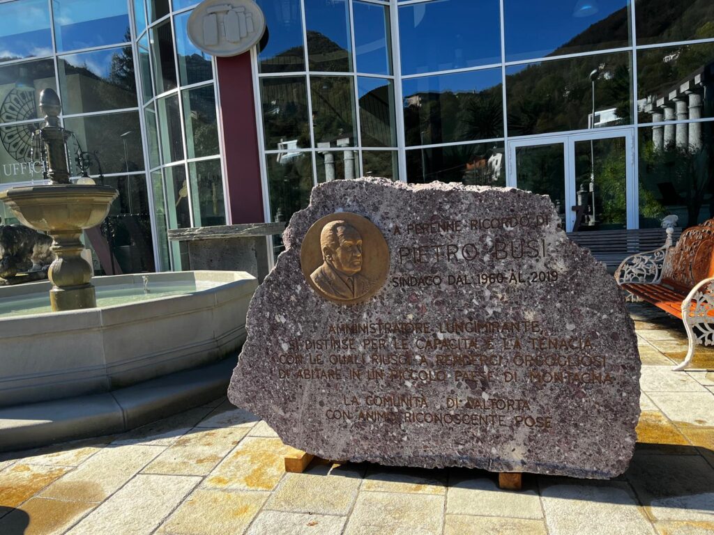 Sul monumento la dedica della comunità: “A perenne ricordo di Pietro Busi, sindaco dal 1960 al 2019. Amministratore lungimirante si distinse per la capacità e la tenacia con le quali riuscì a renderci orgogliosi di abitare in un piccolo paese di montagna. La comunità d Valtorta con animo riconoscente pose”.