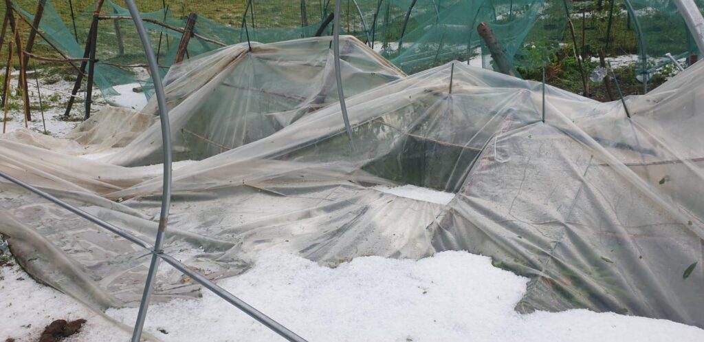 “Campagne bergamasche ancora sfregiate dal maltempo – scrive Coldiretti Bergamo – Secondo una prima ricognizione dei tecnici di Coldiretti Bergamo nubifragi, violente raffiche di vento e chicchi di ghiaccio hanno interessato questa mattina soprattutto la Valle Brembana, la Valle Imagna, la Valle Seriana e la Valle di Scalve. Danneggiate le colture in campo e diverse strutture come serre e tetti di edifici agricoli. Nei comuni di San Giovanni Bianco e Camerata Cornello il forte vento ha ribaltato mezzi agricoli, mentre sul territorio di Oltre il Colle e a Zambla la grandine ha distrutto ciò che rimaneva del primo taglio di fieno e compromesso il secondo taglio. A Vilminore, invece, il caseificio della Latteria è stato allagato ed è stata compromessa la funzionalità di alcuni macchinari. Ovunque si contano numerosi alberi abbattuti che stanno intralciando la circolazione.