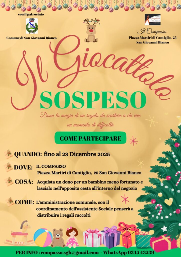 Come a San Pellegrino (cartoleria La Matita), anche a San Giovanni Bianco arriva l’iniziativa solidale “Il giocattolo sospeso”, a favore delle famiglie in difficoltà economica. Fino al 23 dicembre sarà possibile acquistare un regalo alla cartolibreria “Il Compasso” di piazza Martiri di Cantiglio, di Stefano Ghisalberti e Stefania Regazzoni. Il regalo sarà lasciato nell’apposita cesta. Sarà poi il Comune, tramite l’assistente sociale, a far avere il regalo alle famiglie bisognose. “Un gesto di vicinanza e solidarietà importante per la comunità di San Giovanni Bianco e dei Comuni vicini, soprattutto in un periodo delicato come quello attuale”, dice Stefania. L’iniziativa è patrocinata dal Comune.
