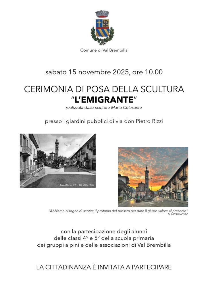 Viene inaugurato sabato 15 novembre, alle 10, nei giardini pubblici di Val Brembilla, una scultura dedicata all’emigrante. Voluta dall’Amministrazione comunale, alla cerimonia di inaugurazione, saranno presenti i ragazzi delle scuole, alpini e associazioni di Brembilla. L’opera è stata realizzata dallo scultore Mario Colasante, già sindaco di Brembilla.