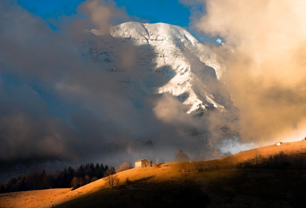 Casolare e Arera innevata al tramonto: di Laura Berbenni