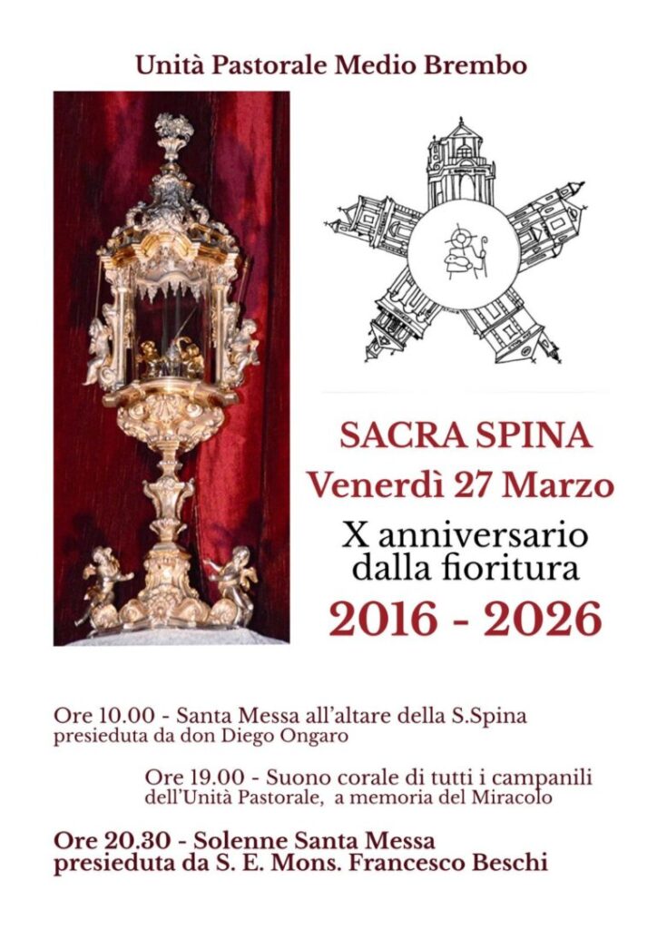 “Con grande gioia posso annunciare che il segno si è manifestato”. Con queste parole scritte dal vescovo di Bergamo Francesco Beschi e pronunciate in chiesa a San Giovanni Bianco, la sera del 27 marzo 2016, da monsignor Davide Pelucchi, veniva annunciato il prodigio della Sacra Spina. Una nuova gemma era apparsa sulla reliquia, verificata da un’apposita commissione medico-scientifica composta da medici, laici, studiosi, sacerdoti.