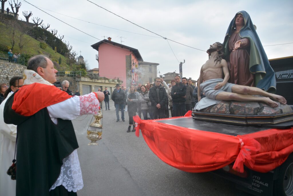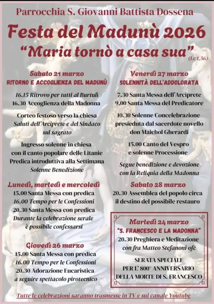 Si rinnova venerdì 27 marzo, a Dossena, la festa del Madunù, dedicata alla Madonna Addolorata. La festa, quest’anno, si terrà con la statua fresca di un primo restauro. Restauro affidato a Gianbattista Gritti e Marcella Ghilardi e costato 32mila euro (22mila euro grazie alle donazioni dei dossenesi, 10mila da bando Cariplo). Durante i lavori si è anche scoperto che la statua è stata ridipinta sei volte. Il 28 marzo ci sarà un’assemblea per decidere se proseguire nel restauro.
