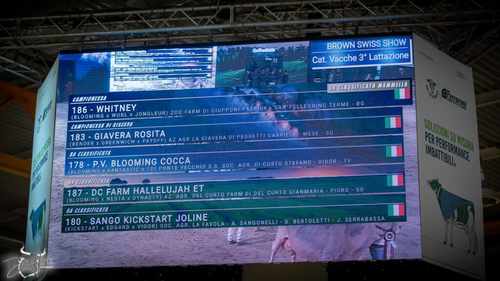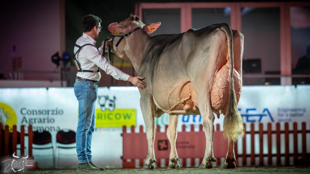 Whitney, la vacca dell’azienda di San Pellegrino, è stata eletta campionessa e ha vinto il titolo per la miglior mammella (nella categoria tre parti), quindi ha conquistato il secondo posto (riserva) per le vacche adulte e il quarto assoluto della fiera. A presentare la vacca sul ring c’era Oscar Vitali di Stabello di Zogno, collaboratore dell’azienda Giupponi.