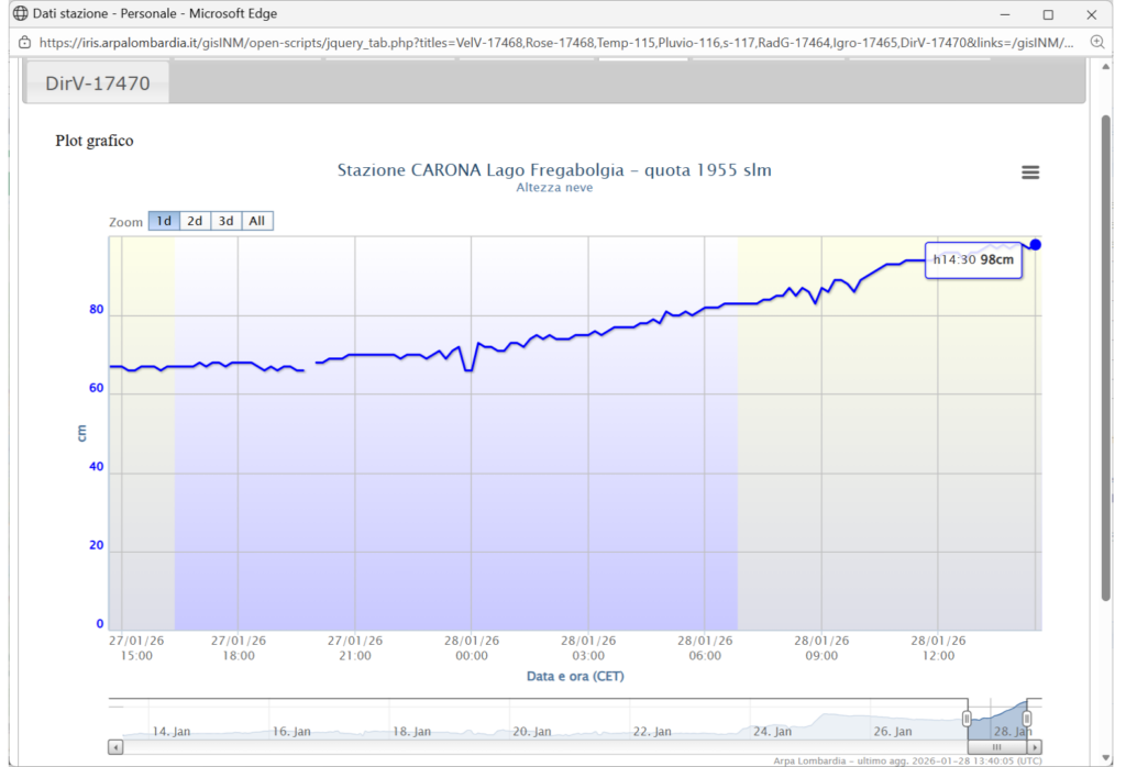 Ancora neve in montagna, con fiocchi che – nella giornata del 28 gennaio – stanno scendendo anche intorno ai mille metri di quota. Ai 1.955 metri della diga Fregabolgia di Carona l’altezza della neve al suolo ha ormai raggiunto il metro (dati centralina Arpa Regione Lombardia).