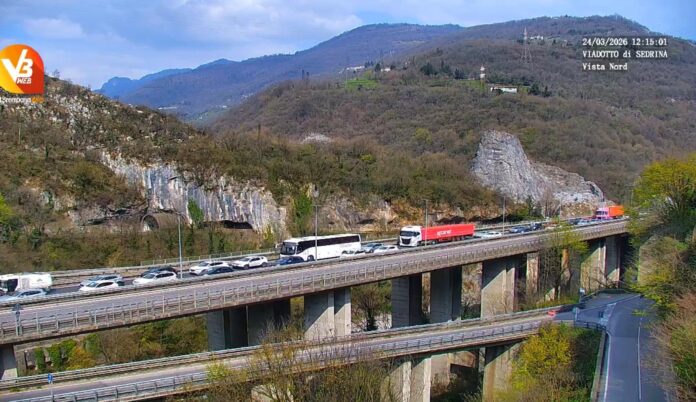 Causa un semaforo che costringe il traffico a senso unico alternato nel tratto di Campana di Villa d’Almè (600 metri secondo ordinanza Anas), dalle 9 del 24 marzo, sono lunghissime le code di veicoli in entrambe i sensi di marcia.