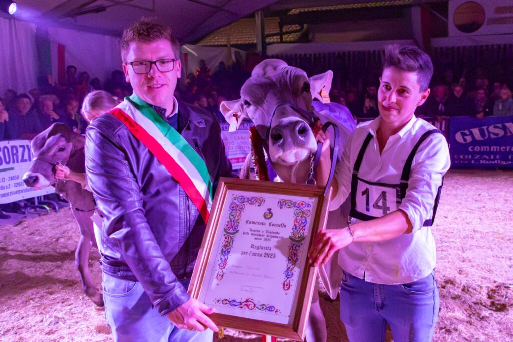 La vacca, di nove anni, è di proprietà della Gamba Farm di Giuseppe Gamba e della sorella Elda di Dossena. In una grandissima cornice di pubblico (esauriti gli spazi ridotti del capannone allestito al campo sportivo), è andata in onda la finalissima che ha eletto Regina e Reginetta delle fiere: 43 i capi in gara per 17 aziende. A fare gli onori di casa il sindaco di Camerata Cornello, Luca Locatelli, presenti il consigliere regionale Alberto Mazzoleni, rappresentanti di Anarb (Associazione nazionale allevatori razza bruna) e Coldiretti.
