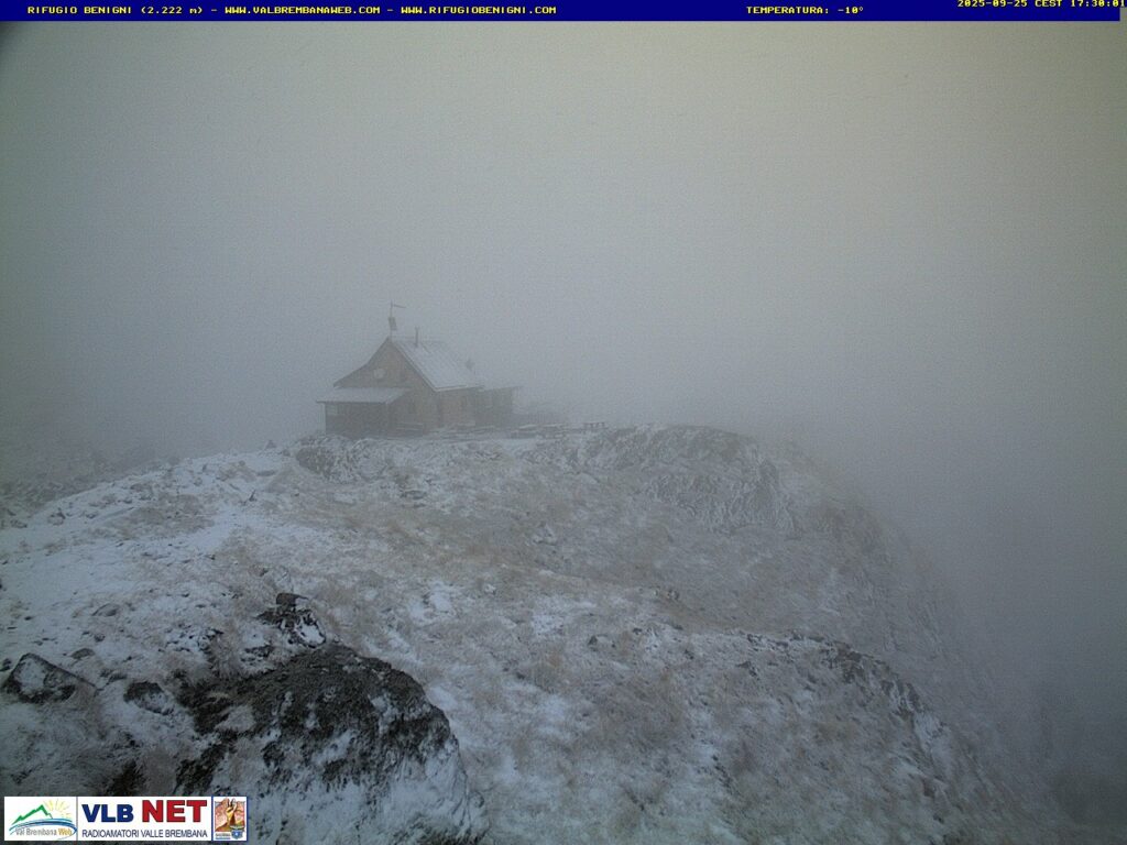 Temperature in discesa in questi giorni anche in Valle Brembana. Con la “colonnina di mercurio” scesa ormai vicino allo zero ad alta quota. Dalla nostra webcam al rifugio Benigni (Ornica) si può vedere la prima neve dell’autunno.