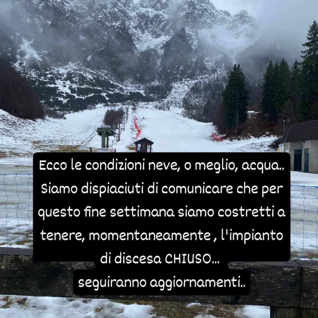 Pioggia anche ad alta quota, clima mite per il periodo. E la neve, quella scesa ancora a fine novembre, ormai si è in buona parte sciolta. Siamo ai 1.600 metri della Conca dell’Alben, dove nei fine settimana scorsi, avevano aperto sia l’impianto di risalita per lo sci di discesa (skilift) sia tre chilometri di anello per lo sci nordico.