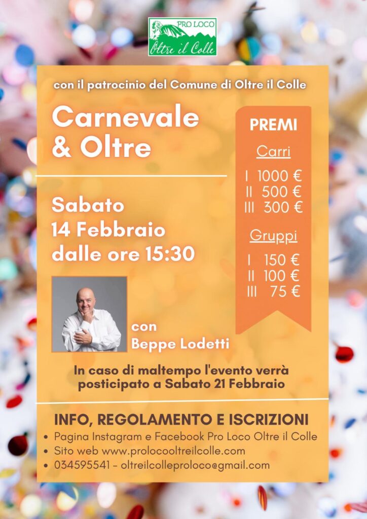 La Pro loco di Oltre il Colle, con la presidente Patrizia Palazzi, organizza il Carnevale a Oltre il Colle in programma per sabato 14 febbraio.