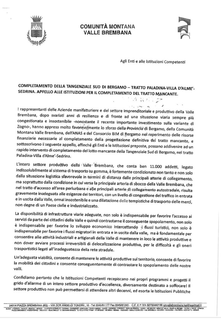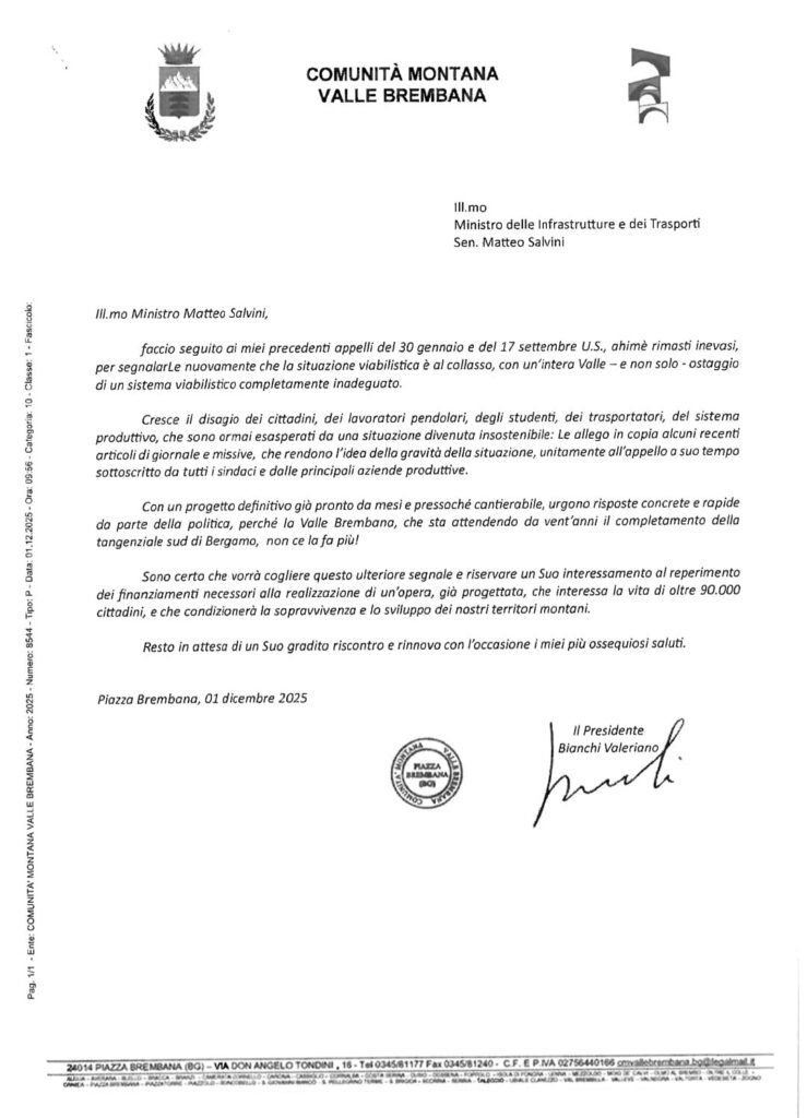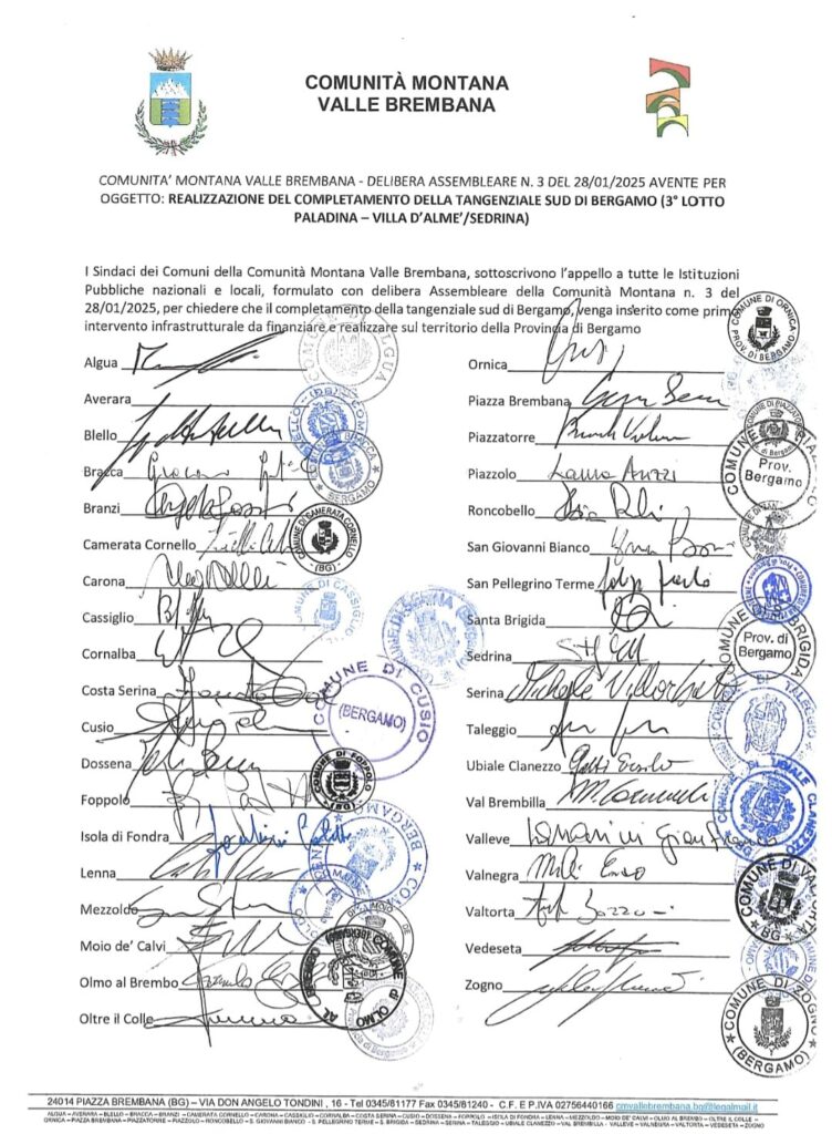 La Comunità montana di Valle Brembana, rispetto alla Paladina-Sedrina, aveva precedentemente deliberato il 28 gennaio 2025. Unitamente all’appello di tutti i 37 sindaci della Comunità montana, si chiedeva al Presidente della Provincia di Bergamo, alla delegazione parlamentare, ai Consiglieri regionali e provinciali bergamaschi un forte e concreto impegno a ogni livello per sostenere la richiesta di finanziamento per la realizzazione della Paladina-Sedrina. Per completezza sono poi stati trasmessi da parte del Presidente della Comunità montana tre consecutivi appelli al ministro delle Infrastrutture e dei Trasporti, senatore Matteo Salvini, con la finalità di portare a compimento la PALADINA-SEDRINA”.