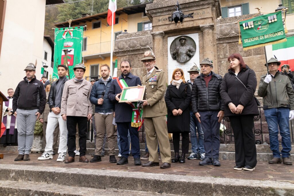 Il premio è stato ritirato dalla figlia Roberta. Il momento culminante della mattinata è stata l’ufficiale assegnazione alle Truppe Alpine della Cittadinanza Onoraria di Piazza Brembana. Un gesto salutato con orgoglio dal generale Alberto Vezzoli che ha ritirato il documento ufficiale. “Pensiamo al valore della Bandiera, ne esponiamo di ogni tipo, ma quella Tricolore solo il 4 novembre, dell’estremo sacrificio (uno dei Fratelli Calvi scelse di arruolarsi quando due fratelli erano già morti), della famiglia. Sostenete le Forze Armate, sempre pronte e presenti”. Un ulteriore corteo ha raggiunto fra gli applausi la parrocchiale di San Martino, dove don Andrea Mazzoleni ha celebrato la messa dedicata agli Alpini morti in battaglia e nelle missioni di pace.