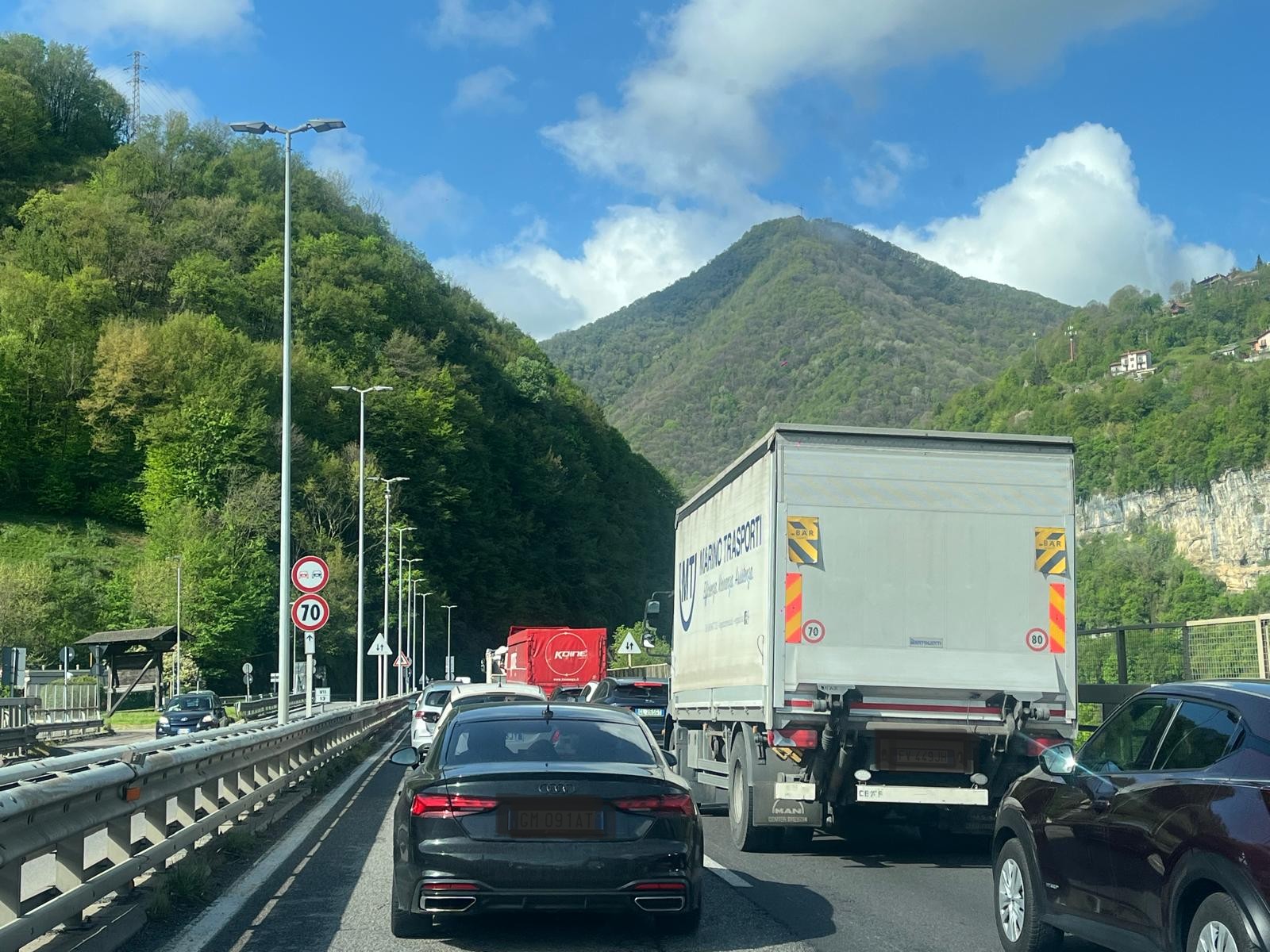 Lavori necessari per la sicurezza ma che, causa il senso unico alternato regolato dagli operai dell’impresa o dal semaforo, stanno – come prevedibile – provocando lunghissime code e disagi agli automobilisti. Code chilometriche dal viadotto di Sedrina a scendere e dalla rotatoria di Arlecchino in direzione dell’alta valle, con decine di camion incolonnati.