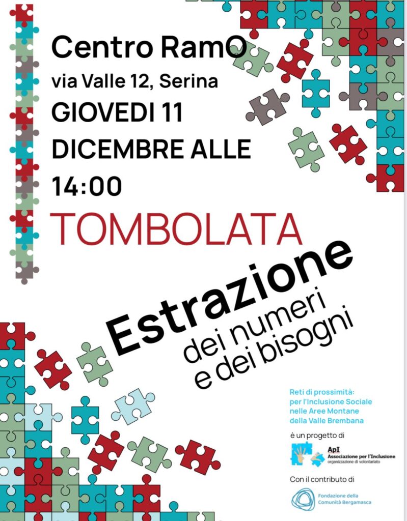 Il prossimo appuntamento del progetto è giovedì 11 dicembre 2025 con titolo “Estrazione dei numeri e dei bisogni” una tombolata “sociale” in compagnia, al Centro RamO di via Valle 12 a Serina. L’ingresso è libero e gratuito.