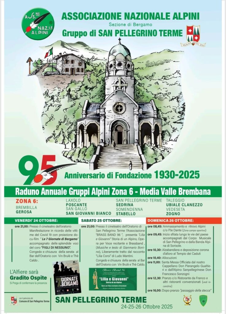 Dal 24 al 26 ottobre il gruppo Alpini di San Pellegrino Terme, costituito nel 1930, festeggia i 95 anni di fondazione. Contestualmente si terrà il raduno dei gruppi di penne nere della zona 6, la Media Valle Brembana: ovvero i comuni di Brembilla, Gerosa, Laxolo, Poscante, San Gallo, San Giovanni Bianco, San Pellegrino, Sedrina, Somendenna, Stabello, Taleggio, Ubiale Clanezzo, Vedeseta, Zogno.