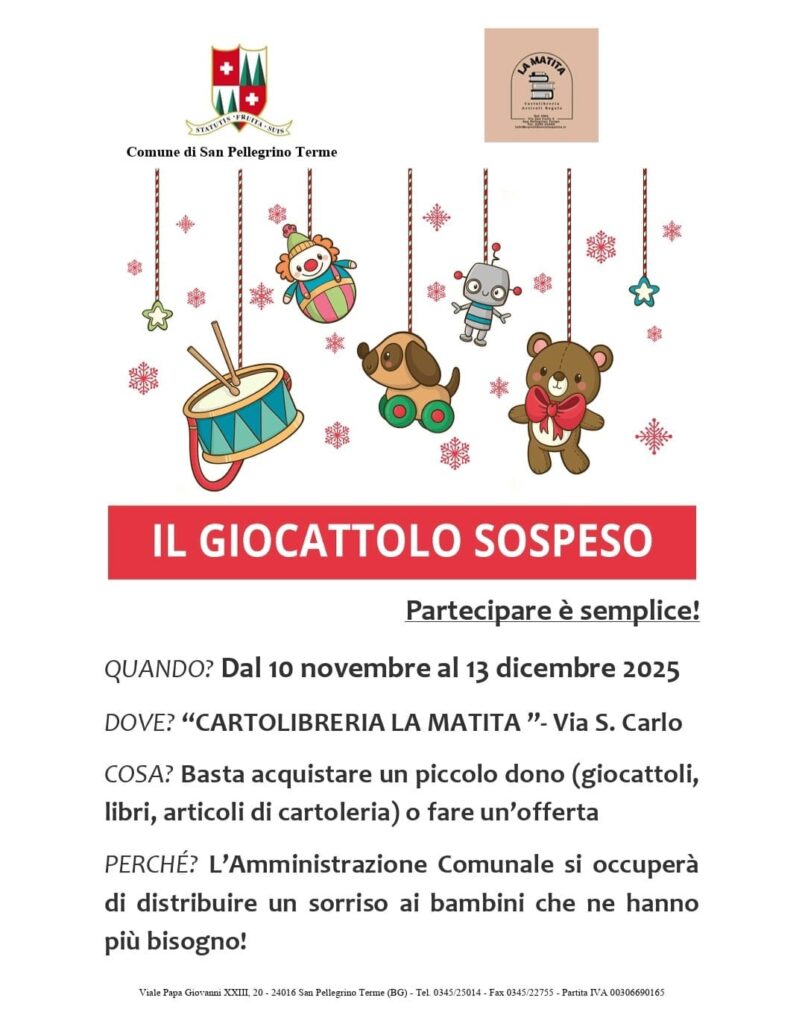 Un giocattolo per le famiglie con bambini ma in difficoltà economiche. E’ l’iniziativa che viene riproposta anche quest’anno, dal 10 novembre al 13 dicembre con la cartolibreria “La Matita” di Aurora e Alexandra Milesi, a San Pellegrino e in collaborazione con i servizi sociali.