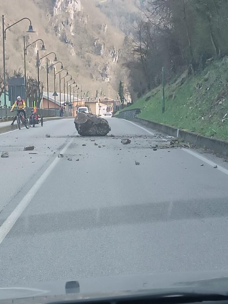 Un grosso masso, più altri di dimensioni minori che si sono spezzati durante la caduta, sono precipitati dal versante a monte, nel primo pomeriggio di lunedì 16 marzo, in via Tasso a San Pellegrino, la strada comunale che collega il centro cittadino con la località San Rocco, nei pressi del ponte che porta alla variante in galleria.