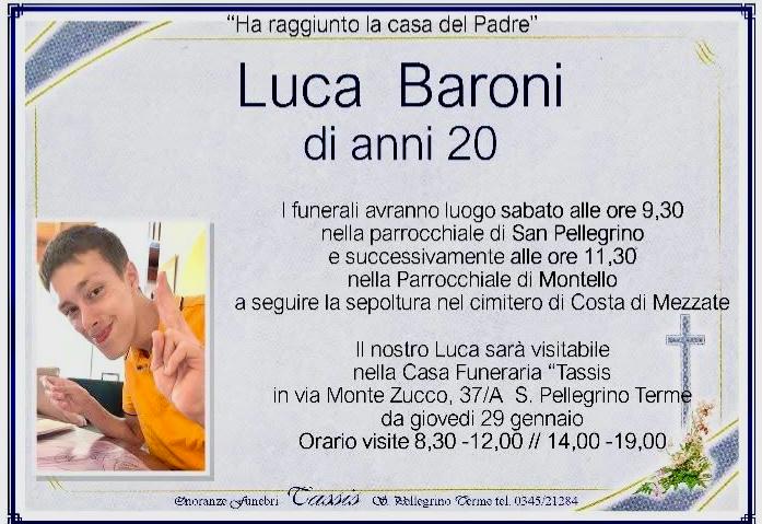 La salma è composta nella casa del commiato Tassis di San Pellegrino. I funerali saranno celebrati sabato 31 gennaio, alle 9,30, poi il trasferimento a Montello, dove sarà sepolto. Luca Baroni lascia nel dolore mamma Daniela, papà Armando, la sorella Azzurra, il nonno Santino e familiari tutti.