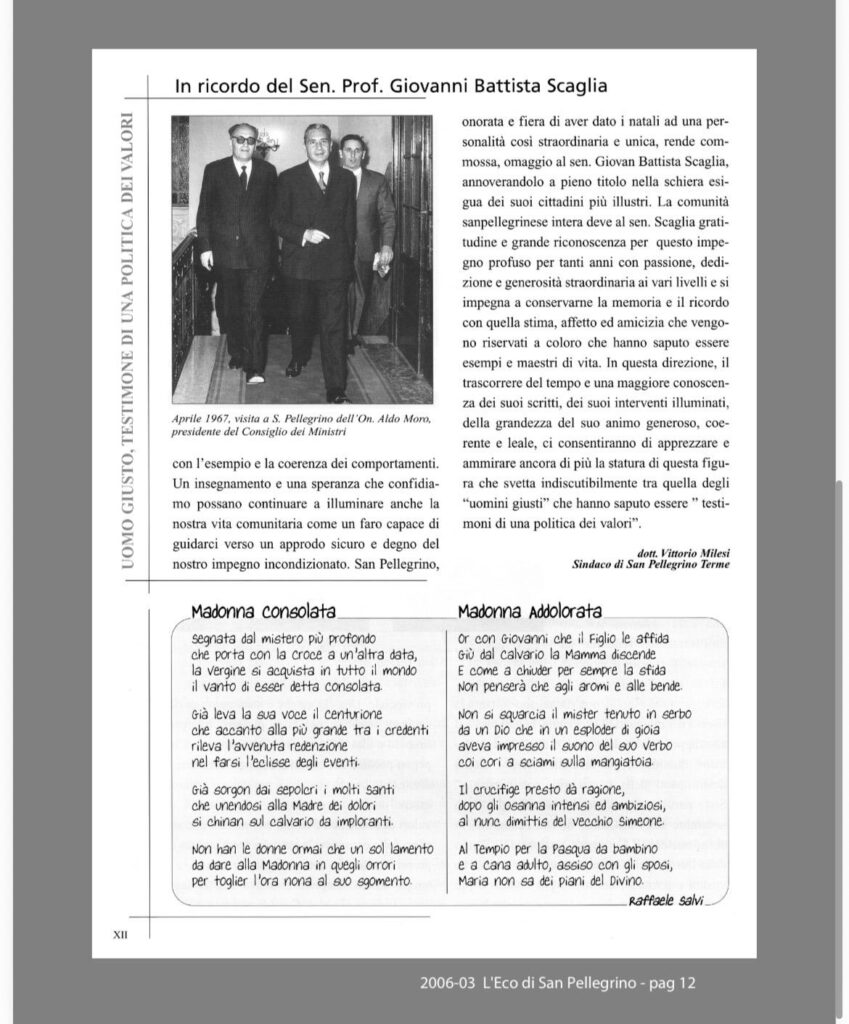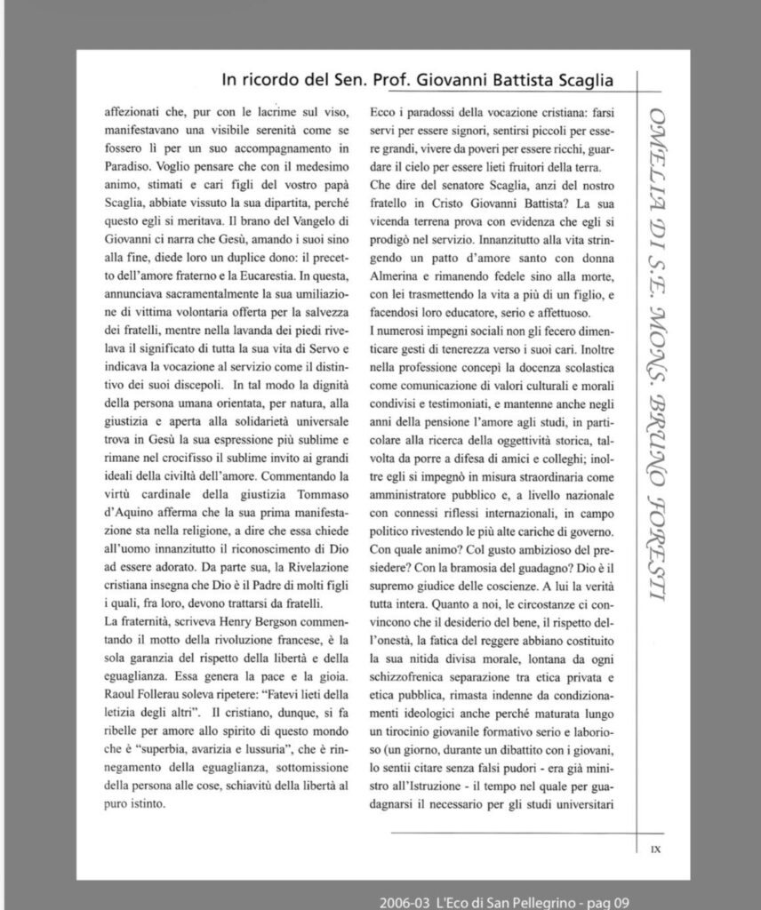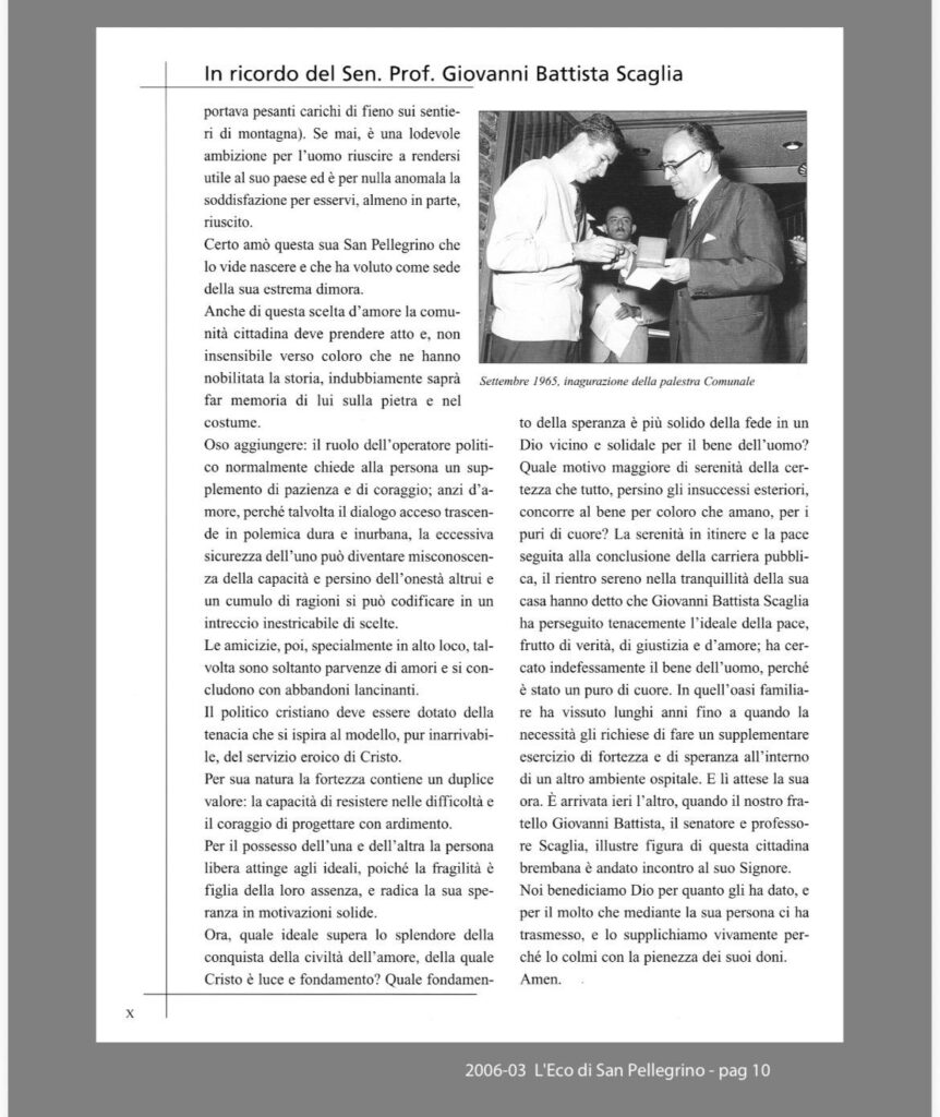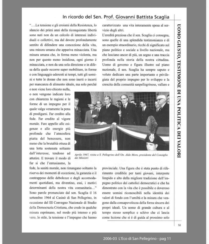 Per l’occasione, accanto al ricordo del sen. prof. G.B. Scaglia, vengono riproposti due testi significativi pubblicati sul Bollettino Parrocchiale n. 3 del marzo 2006, che testimoniano la statura umana, civile e spirituale dello statista: