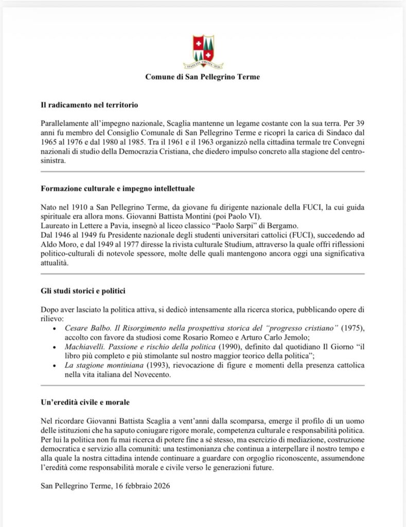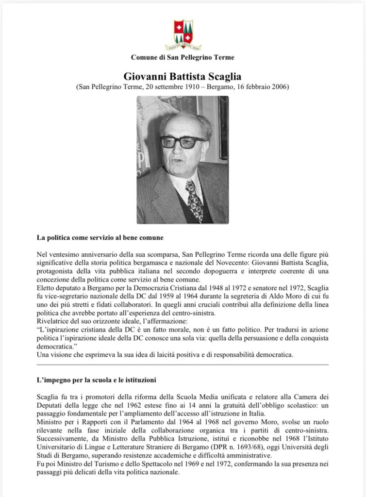 IL COMUNE DI SAN PELLEGRINO TERME, NEL VENTESIMO ANNIVERSARIO DELLA SCOMPARSA, RICORDA IL SUO CITTADINO PIU’ ILLUSTRE, IL Senatore professor GIOVANNI BATTISTA SCAGLIA