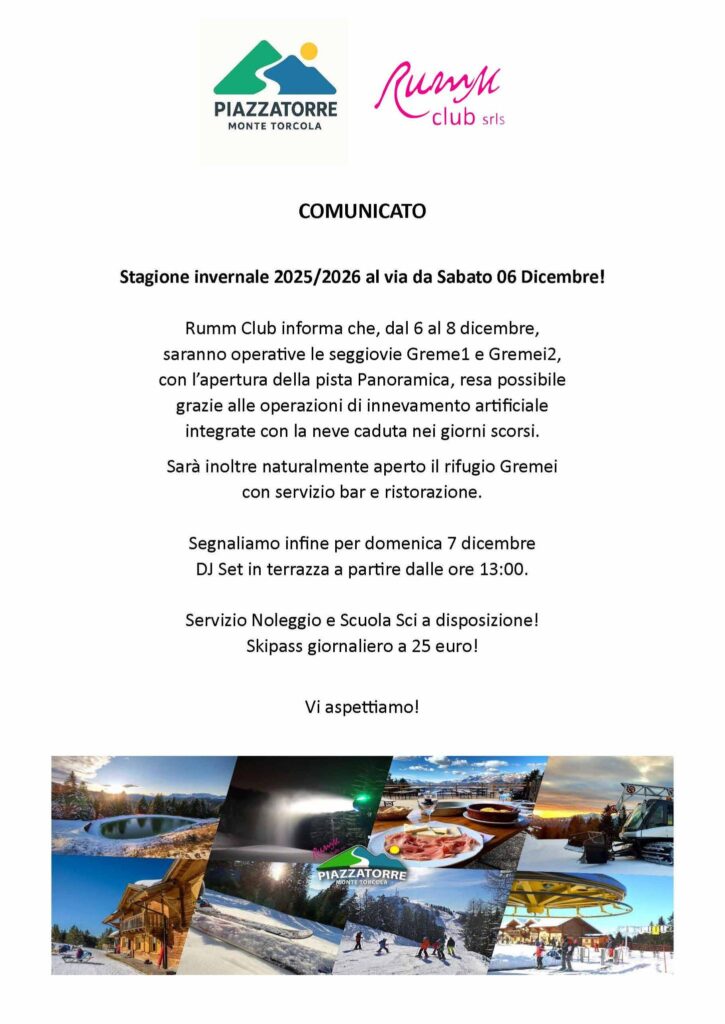 Pronta a partire per la stagione sciistica 2025-26 anche Torcola Vaga di Piazzatorre, gestita dalla Rumm club di Renato Cristiano. Sabato 6 dicembre entreranno in funzione le seggiovie Gremei 1 fino al rifugio e la Gremei 2. Aperta la pista panoramica (azzurra) grazie all’innevamento programmato e alla neve caduta negli ultimi giorni.