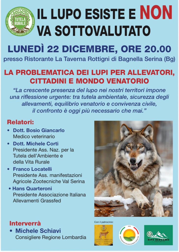 Lunedì 22 dicembre, alle 20, alla Taverna Rottigni di Bagnella di Serina, si terrà un incontro avente per tema proprio il lupo e i suoi pericoli.