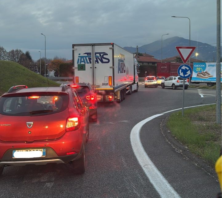 L’ingorgo alla rotatoria di Arlecchino mercoledì 19 novembre (Copyright Valbrembanaweb)