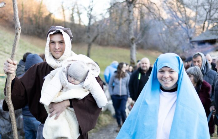 Allestito dalla Pro loco di Pizzino, con l’Ecomuseo Val Taleggio e gli Amici del Presepe Vivente di Enus Milesi, ha visto la partecipazione di decine di figuranti e centinaia di spettatori. A rappresentare la Natività c’erano Elisa Garzetti con Mattia Arnoldi e il loro primogenito Davide, l’unico bambino nato quest’anno con radici in Valle Taleggio (altre nascite ci sono state nella comunità di richiedenti asilo a Sottochiesa e Costa d’Olda).