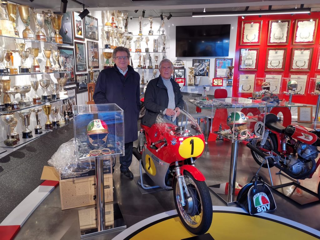 Il pluricampione Giacomo Agostini, ha ricevuto nella sua “sala trofei” a Bergamo il presidente dell’ACI, Valerio Bettoni; il vicepresidente Antonio Bonomi e il direttore Giuseppe Pianura. È una galleria di titoli, premi, trofei, riconoscimenti conquistati durante una prestigiosissima carriera tuttora senza termini di paragone per numero, valore e durata nel tempo. Giacomo Agostini ha vinto 18 titoli italiani e 15 mondiali: un’icona della MV Agusta. Indimenticabili quelle stagioni dove a dominare la cronaca erano sempre due nomi: il super-rivale, l’inglese Mike Hailwood, e lui, il trionfatore sistematico Agostini. E dire che prima di esordire, il nostro recordman aveva come sogno quello di vincere una gara! Ne ha collezionato un “firmamento”. Quando è malinconico, Giacomo Agostini – lo ha detto alla delegazione ACI che s’è recata per ufficializzare e ringraziare il campione della sua qualificante disponibilità – risolleva il morale ripercorrendo il suo straordinario passato.