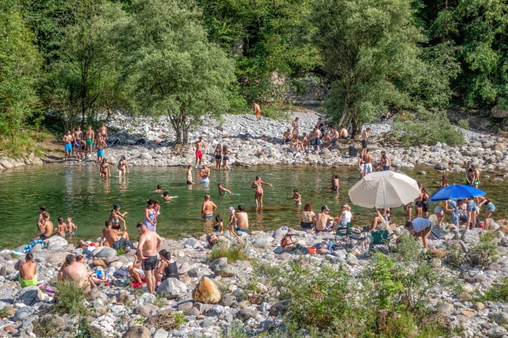 Bagnanti in cerca di refrigerio sul Brembo, in località Parina, a Camerata Cornello - giugno 2025
