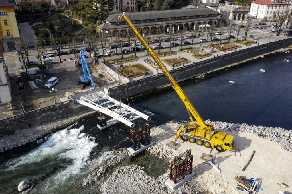 Nella giornata dell’8 febbraio ha avuto inizio la posa del nuovo ponte pedonale di San Pellegrino. Con due grandi gru sono state posizionate le parti metalliche. Il nuovo ponte parte da viale Papa Giovanni XXIII, all’altezza del monumento dedicato al Papa, per arrivare in via Belotti nei pressi dello stadio comunale, permettendo un rapido collegamento anche con il parcheggio multipiano dietro il Grand Hotel. Il ponte è ad arcata unica, lungo 68 metri e larga 6,7 metri sui due lati che si ridurranno a 3,50 metri al centro, nel punto più panoramico.