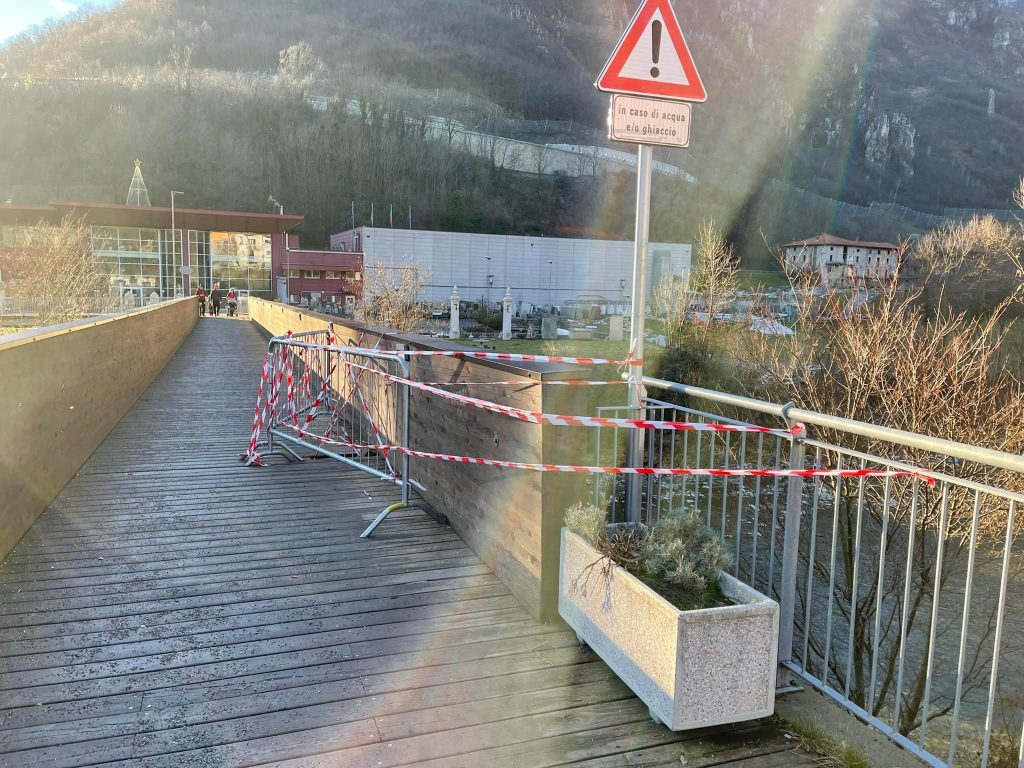 Un asse del piano di calpestio della passerella, posata alcuni anni fa dalla Comunità montana Valle Brembana, è stato distrutto. A causare il danno un vandalismo o forse una bomba carta malcontrollata. Su segnalazione di alcuni passanti e anche dei vigili del fuoco di Zogno, il Comune ha quindi provveduto a transennare il punto in cui è stato rotto l’asse. Il buco che si è venuto a creare potrebbe rappresentare un pericolo, in particolare per i ciclisti. Occorre quindi fare attenzione al passaggio.
