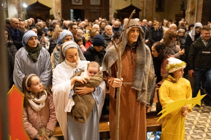 Tra le braccia di mamma Cinzia Baldaccini (che impersonava Maria), accompagnata dal marito Oscar Zani (Giuseppe), residenti a Fuipiano, c’era il loro primogenito Martin. Circa 300 le persone che hanno preso parte al corteo e poi alla celebrazione, per rivivere la notte santa del 2025.