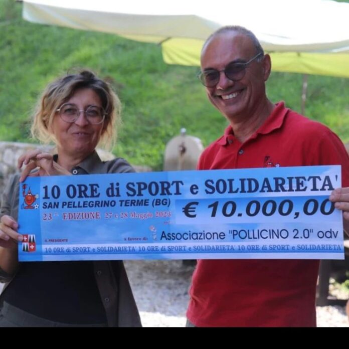Sono stati consegnati il 2 settembre, alla “Baita degli Alpini” delle Foppette di San Pellegrino, i fondi raccolti dalla “10 ore di sport e solidarietà” che si è tenuta la scorsa primavera nella cittadina termale. I 10mila euro raccolti sono stati consegnati dal presidente della “10 ore” Valentino Conti, a Viviana Rucci, presidente dell’associazione Pollicino 2.0 Odv., impegnata nel sostegno a famiglie con bambini disabili.