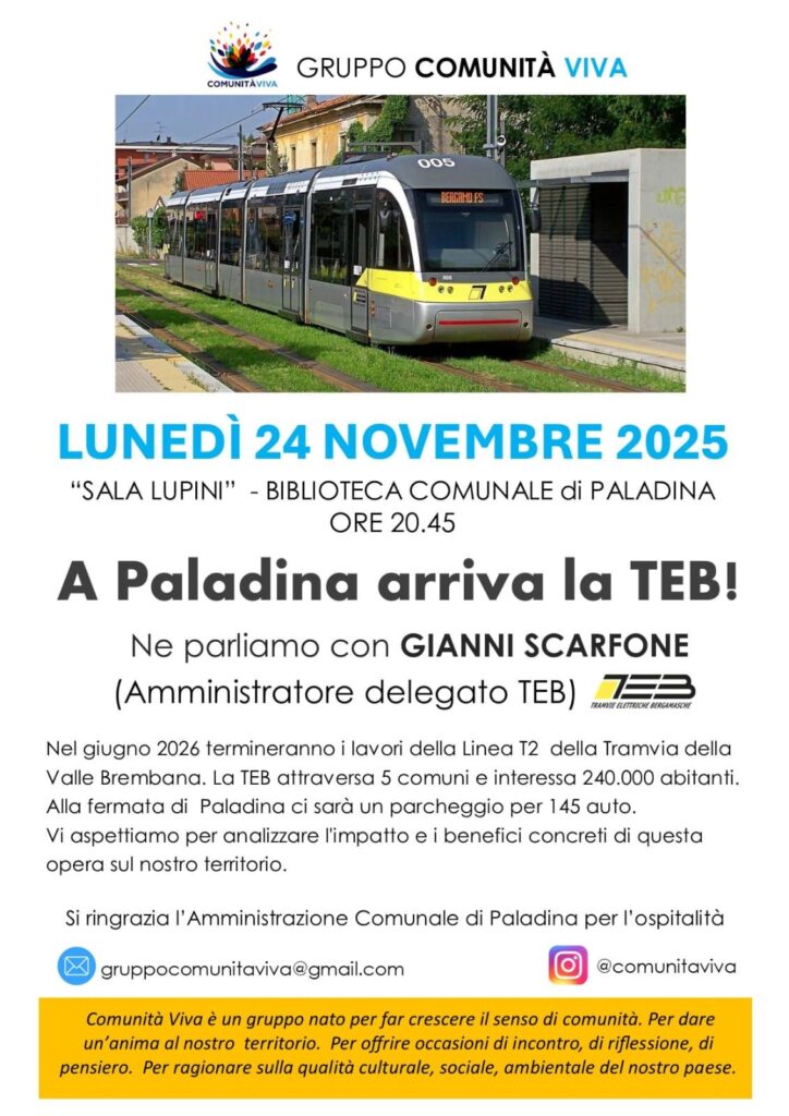 Il gruppo Comunità Viva organizza per lunedì 24 novembre, alle 20,45, nella sala Lupini della biblioteca di Paladina, un incontro su impatto e benefici della tramvia Bergamo-Villa d’Almè, che sarà conclusa nel giugno 2026 ed entrerà in funzione nel settembre 2026. La fermata di Almè-Paladina avrà un parcheggio con 145 posti auto.